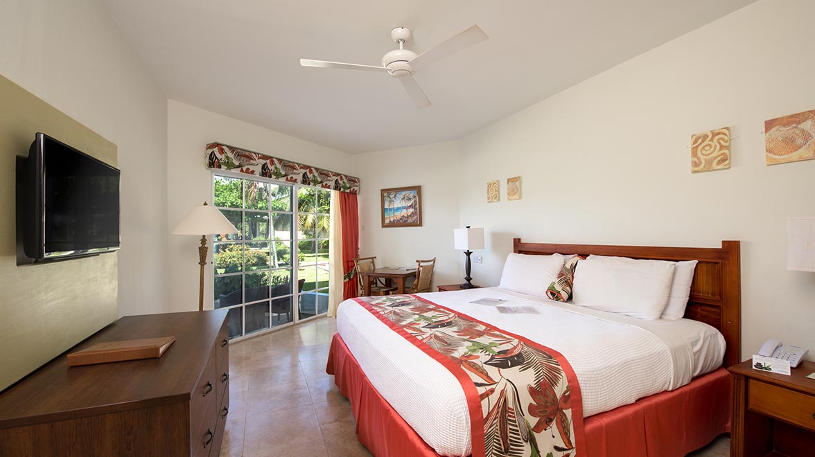 The resort’s 80 air-conditioned rooms are housed in two-storey, pavilion-style buildings scattered throughout the grounds. Each is simply furnished and decorated in a colourful, tropical style featuring a king size or two double beds, ceiling fan, cable TV, mini fridge, tea/coffee making facilities, bathroom with bath and shower, a sitting area and a private terrace or balcony with views of the pool/gardens or ocean.