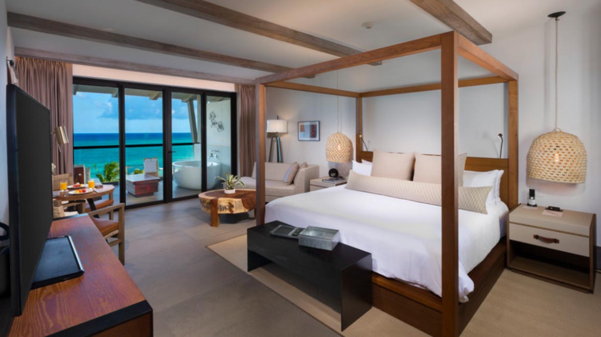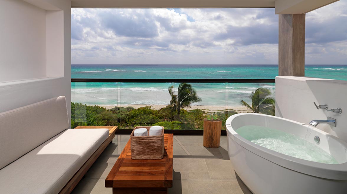 Each of the 448 guest rooms are elegantly furnished with natural and handmade materials, taking inspiration from the character of the Riviera Maya. An impressive 90% of rooms have views of the ocean, and each includes a local host, 55” TV, minibar stocked according to preference, Bluetooth sound system, Nespresso machine, bathrobe and slippers, custom scent amenities and complimentary WiFi. All ground floor rooms have swim-up pools with a terrace area and chaises. All other rooms feature a hydro-spa tub on the balcony. The two-bedroom Estancia Suite features a large living room, expansive terrace with two hydro spa tubs accessible from both bedrooms, and stunning ocean views. Villa 20° 87° looks out over the white-sand beach and features two master bedrooms, two bathrooms, a kitchen, dining room, living room, bar and terrace with two hydro-spa tubs.